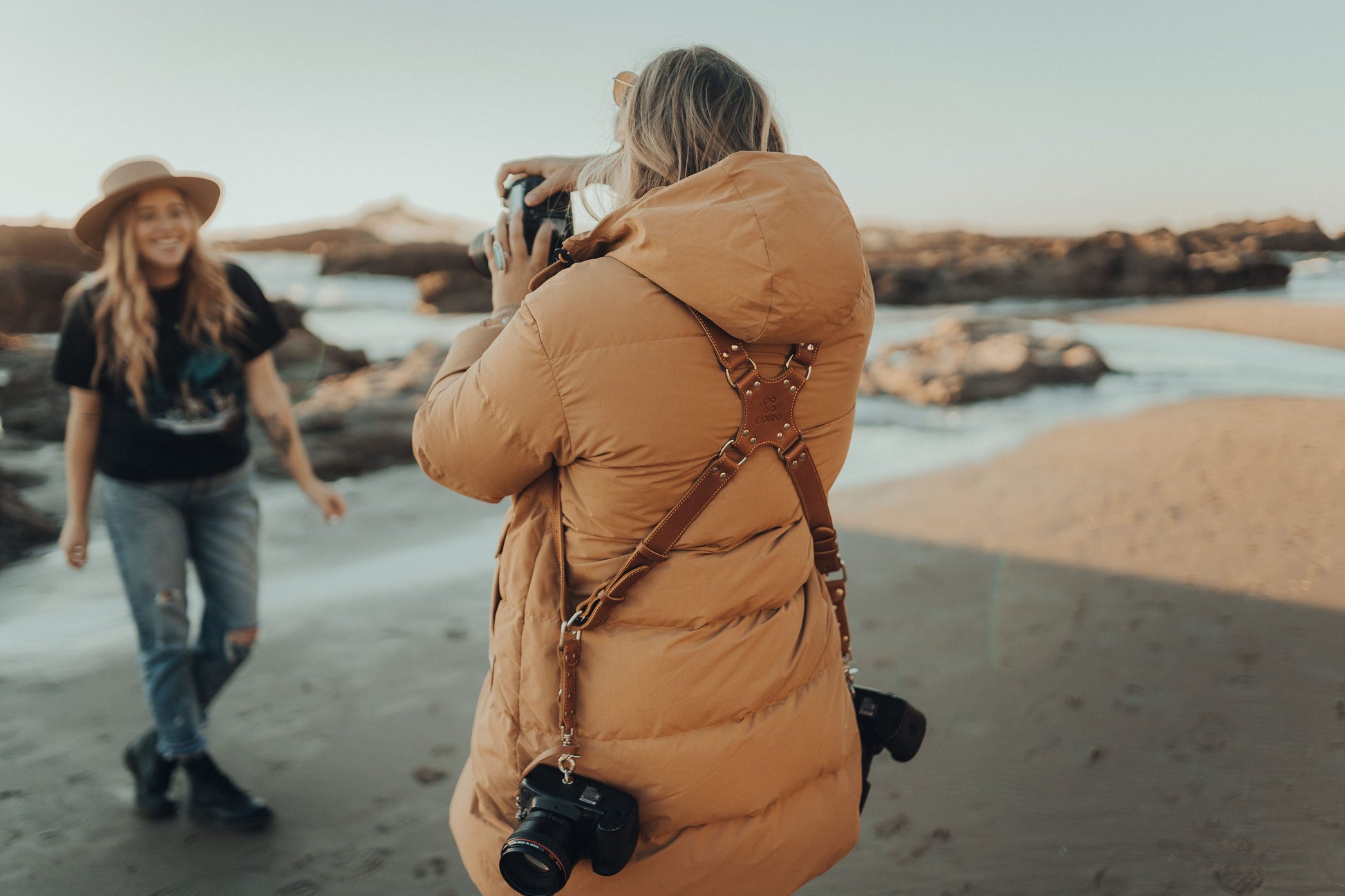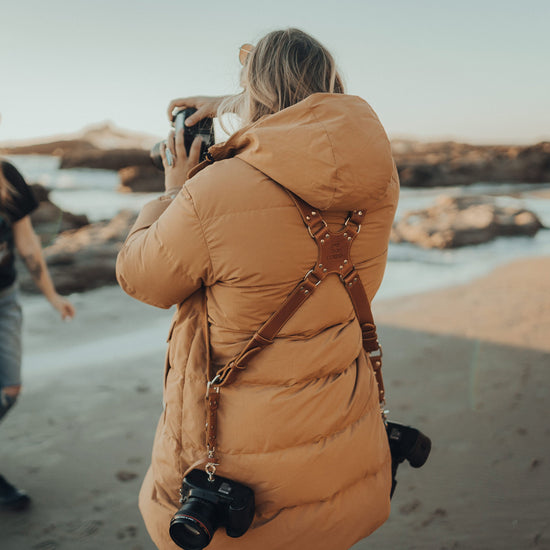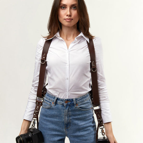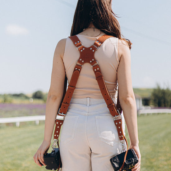 Elevate your photography setup with our tan dual camera harness, meticulously crafted to provide exceptional security and comfort while sparking your creative drive. Designed to accommodate two cameras with ease, this versatile camera strap ensures you never miss a shot and maintains a stylish look.